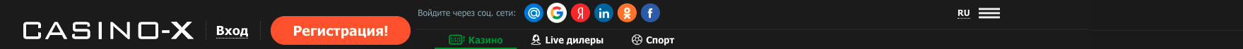 В верхней части сайта Казино Х закреплены логотипы социальных сетей, через которые пользователь может авторизоваться и получить доступ к личному кабинету. Здесь де находится кнопка «Регистрация». В правом верхнем углу можно развернуть дополнительный блок меню: